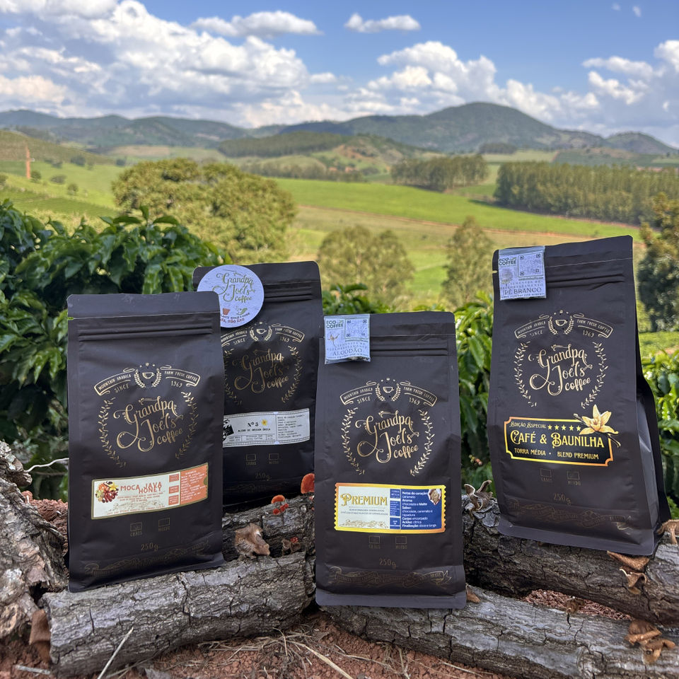 Em cada pacote de 250 g de grãos inteiros, você recebe a síntese da qualidade artesanal e da tradição que definem a essência da Grandpa Joel’s Coffee.